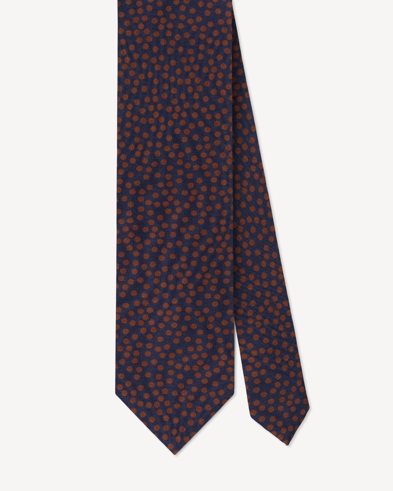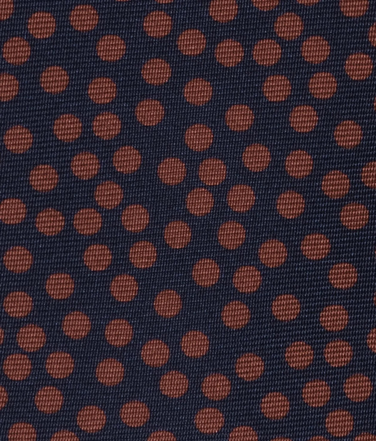 Multi Dot 3-fold Handprinted Selftipped silk tie – Navy/Brown